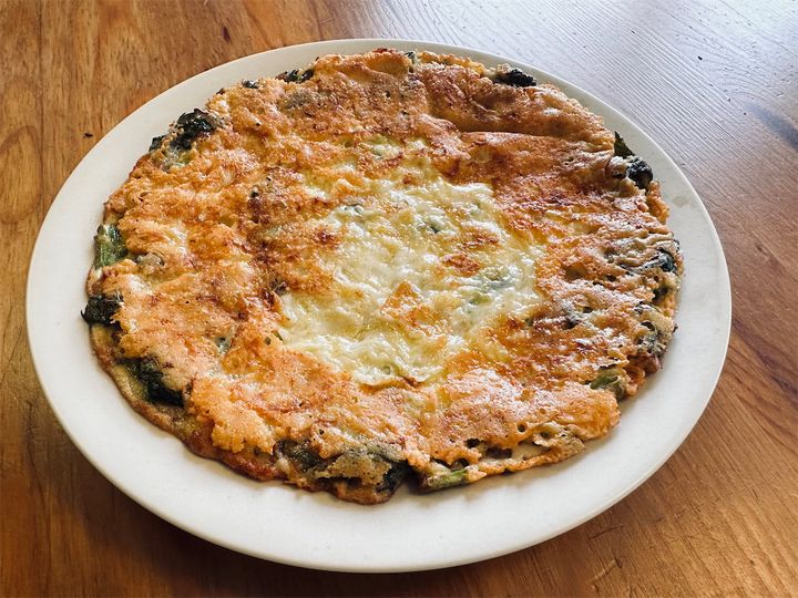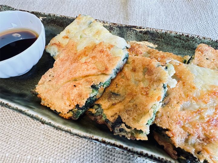 チヂミといえば、ニラを入れるのが一般的ですが、代わりにほうれん草を使うと、お味にクセが少ないですね。チーズとの相性も◎。