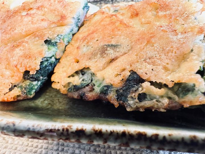 3. チーズまみれな「ほうれん草のちぢみ」作ってみた!カリッカリなのに濃厚って反則級だわ♡【農家直伝】