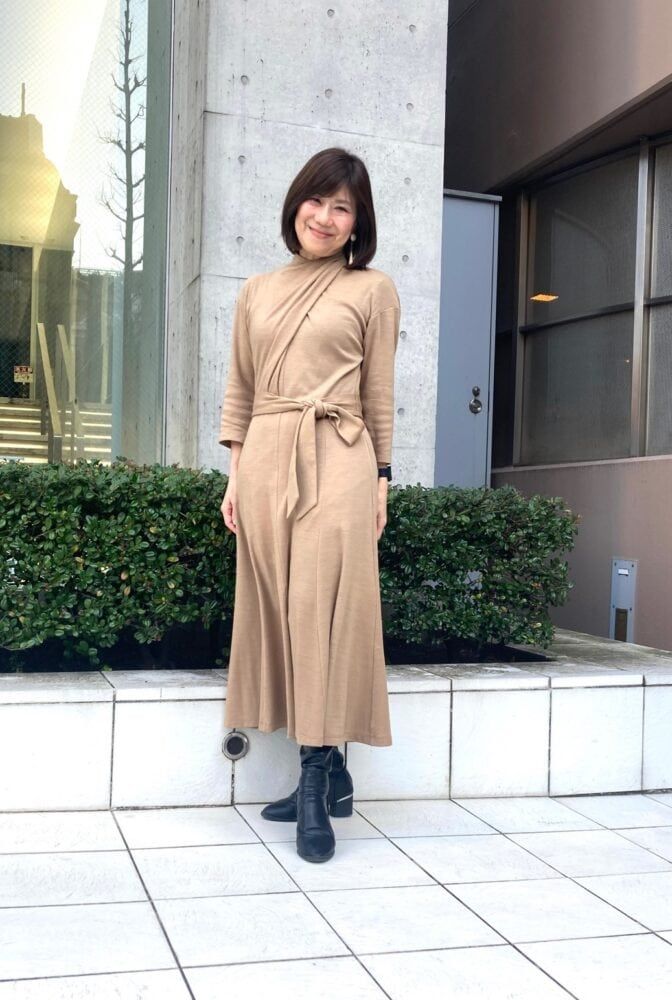 「最近は、きちんと感が出せるワンピースを着ることが多いです」と話す、柴田さん。この日のワンピースは「ロペ」のもので、360度どこから見てもきれいに見える、というコンセプトのもの。「首まわりに自然なドレープがあり、アクセサリーがなくても程よく華やか。腰まわりにある共布のベルトでウェスト位置を高く見せられ、スタイルアップできるワンピースです」。ジャージ素材で着やすいのに、きれい目に着られるのもお気に入りポイントなのだそう!