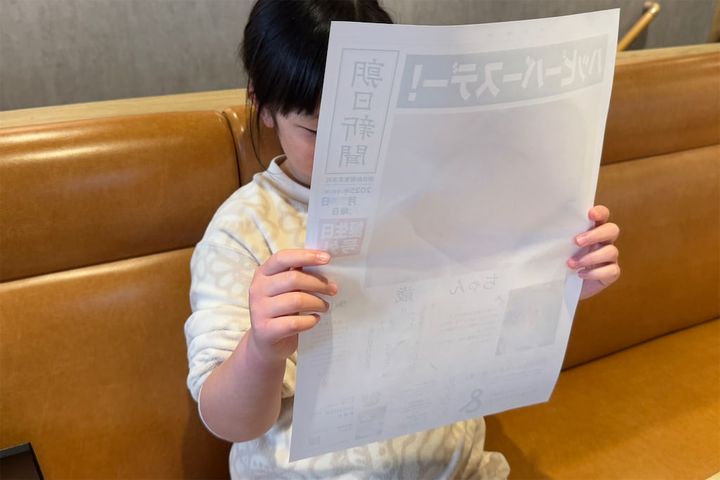 A3サイズの片面印刷で、朝日新聞のロゴや見出しのフォント、紙面のデザインが本物の新聞っぽい!