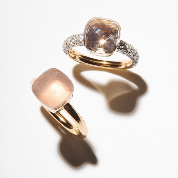 カラーストーンの魅力が最大限に引き出されるセッティングの憧れリング。リング「ヌード」上から〈RG×WG×ホワイトトパーズ×D〉¥715,000〈RG×WG×ローズクォーツ〉¥363,000(ともにポメラート/ポメラート クライアントサービス)