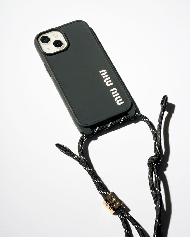 ブランドロゴがぐっと映える、シンプルで飽きのこない黒のカバー。ショルダーストラップで旬なスポーティ要素をプラス。iPhone15カバー¥57,200※予定価格(ミュウミュウ/ミュウミュウ クライアントサービス)