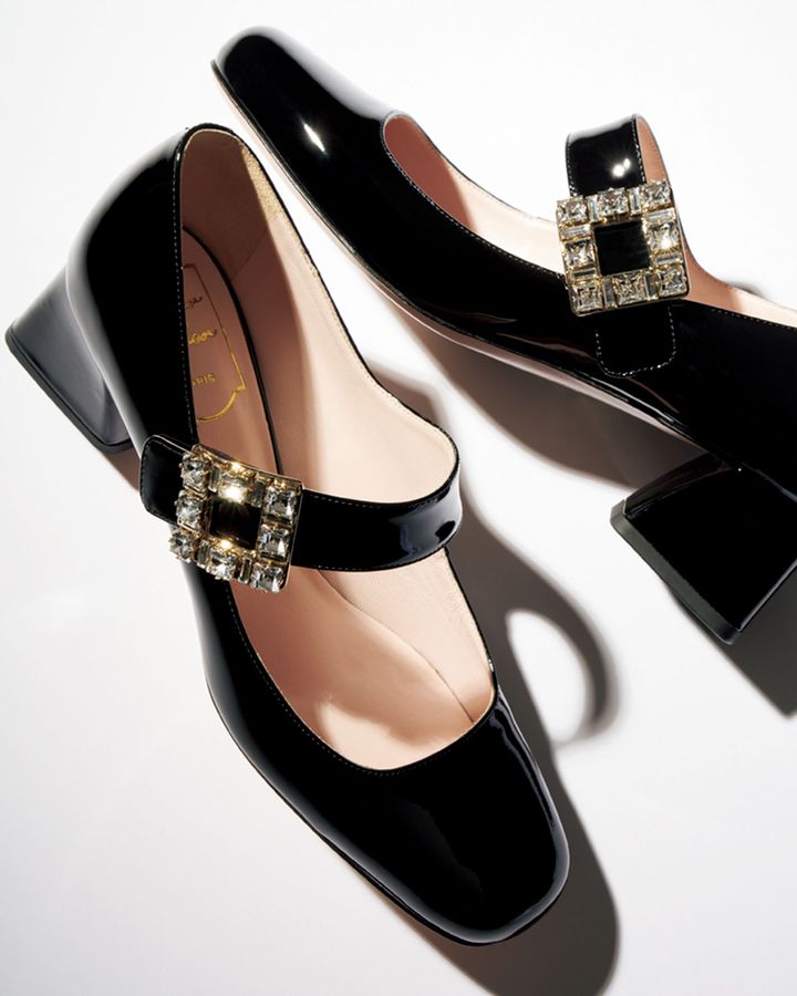 アイコニックなクリスタルバックルで足元に自信。パンプス「トレ ヴィヴィエ パテントレザー メリージェーン パンプス」¥204,600(ロジェ ヴィヴィエ/ロジェ・ヴィヴィエ・ジャパン)