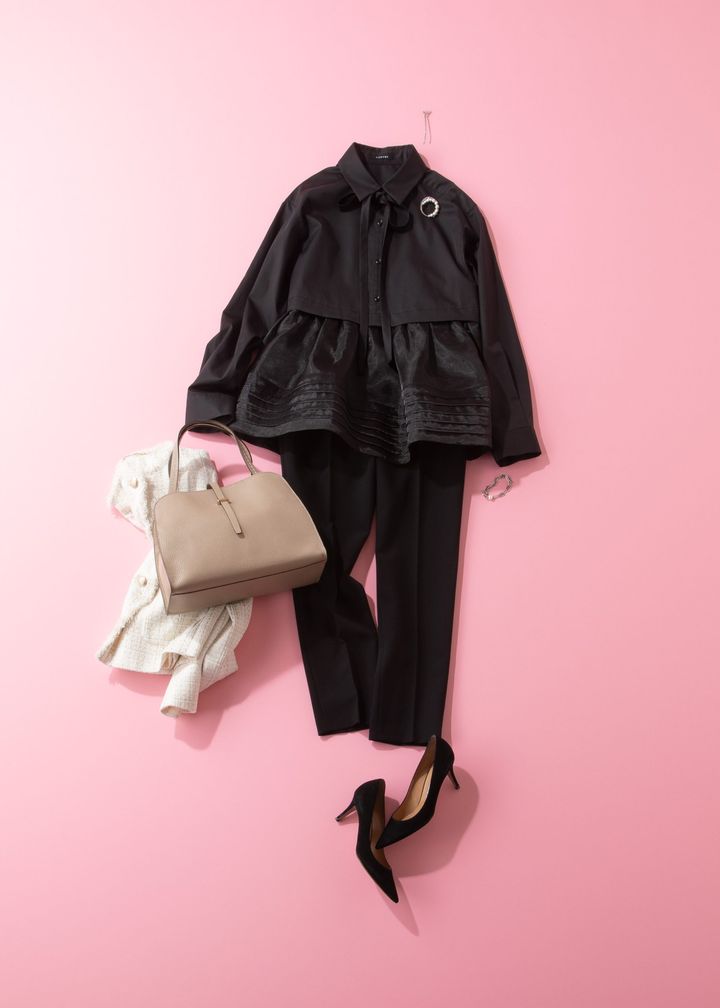 リボンタイ、ペプラム、シースルー、たくさんのトレンドを盛り込んだトップスは一枚でも目を引く華やかさ。ジャケットを羽織ってもペプラムが程よく見えてまた違った表情に。バッグとジャケットは明るい色をセレクトし、コーデに華を添えます。