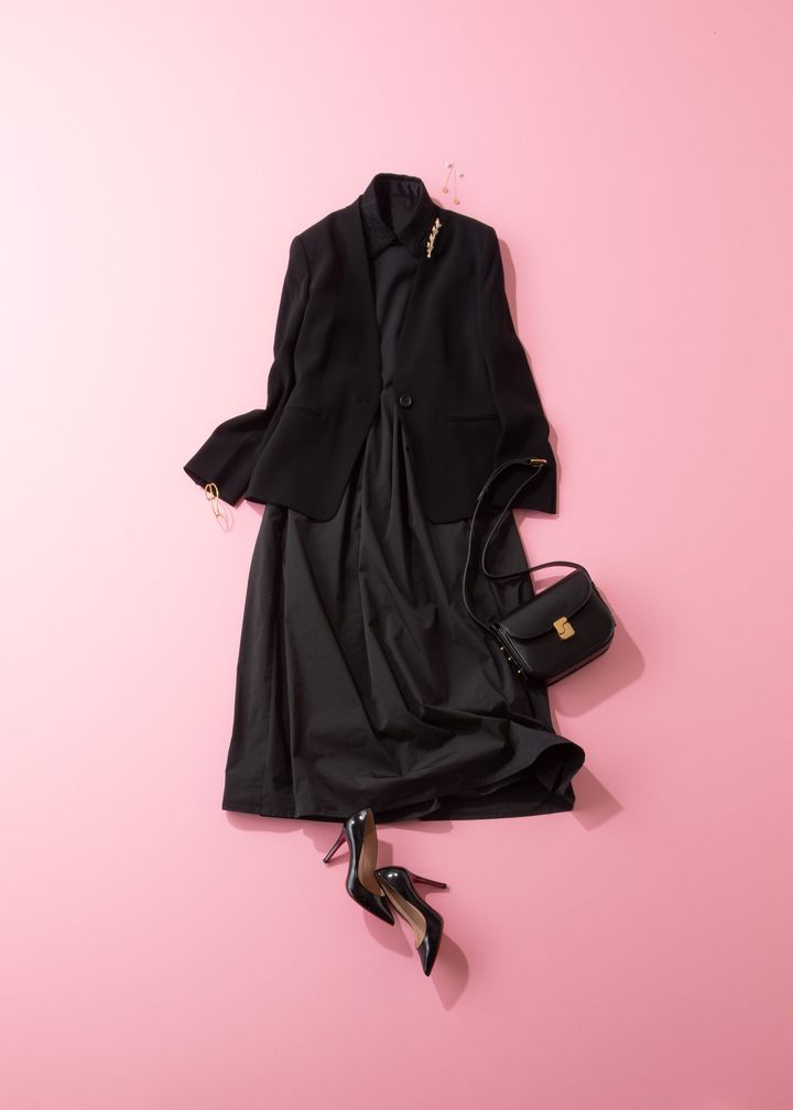 洗練された大人のオンスタイルが叶う”THE” THIRD MAGAZINE。フレンチレースのつけ衿がついたコンビネーションドレスはボリュームのあるスカートが魅力的。そこにノーカラーの上質なハンサムジャケットを投入。バッグ、パンプスもあえて黒で統一し、きちんと感と個性映えを兼ね備えたセレモニーコーデです。
