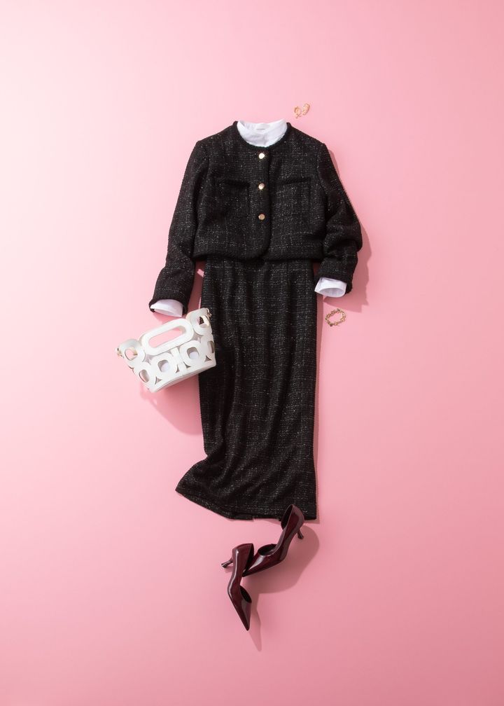 セレモニーで人気のツイードラメセットアップは華やかさとクラシカルさを両立できます。短丈のジャケットとIラインを意識したスタイルはスタイルアップも叶いコンサバになりすぎることもありません。アクセサリーは控えめでも表情豊かなツイードの生地感が華やかさを後押し。記念写真でも明るく華やぎます。