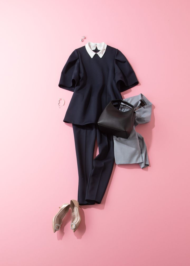 ジャケット¥110,000パンツ¥77,000(ともにコラム)ブラウス¥29,700(アナイ)バッグ¥7,700(ル タロン)シューズ¥18,150(ダイアナ)ピアス¥129,800(ヴァンドーム アオヤマ)