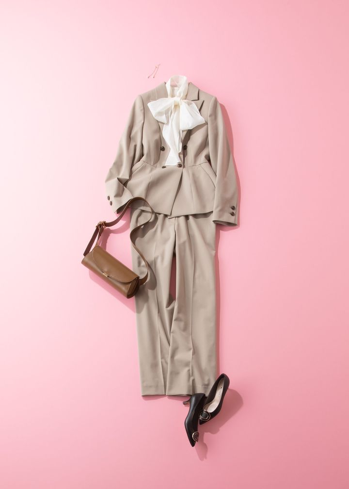 ペプラムジャケットが新しい印象のパンツスーツ。大ぶりリボントップスを合わせて上半身をより華やかに。エッジの効いたモードな雰囲気のバッグと黒パンプスで全体のバランスを取り、コーデを引き締めます。ベージュの明るめカラーで気分も晴れやかに、洗練された大人のセレモニースタイルです。