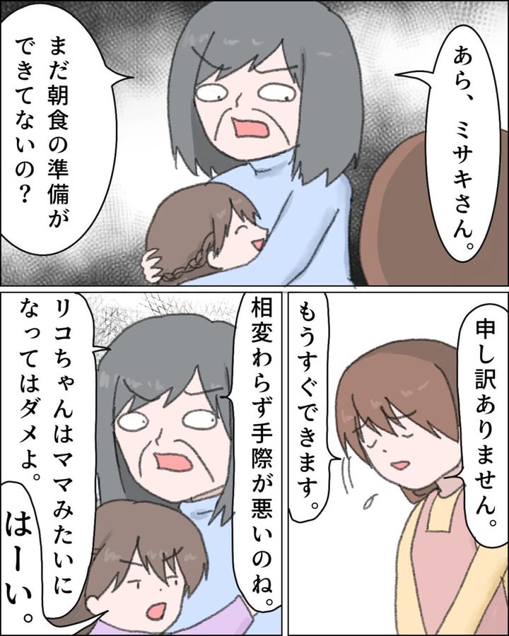 「申し訳ありません。もうすぐできます」ミサキさんが謝ると「相変わらず手際が悪いのね。リコちゃんはママみたいになってはダメよ」