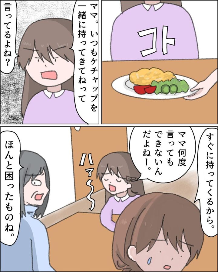 そして急いで朝食の準備をし、テーブルに運ぶと「ママ。いつもケチャップを一緒に持ってきてねって言ってるよね?」リコちゃんが怒って言いました。