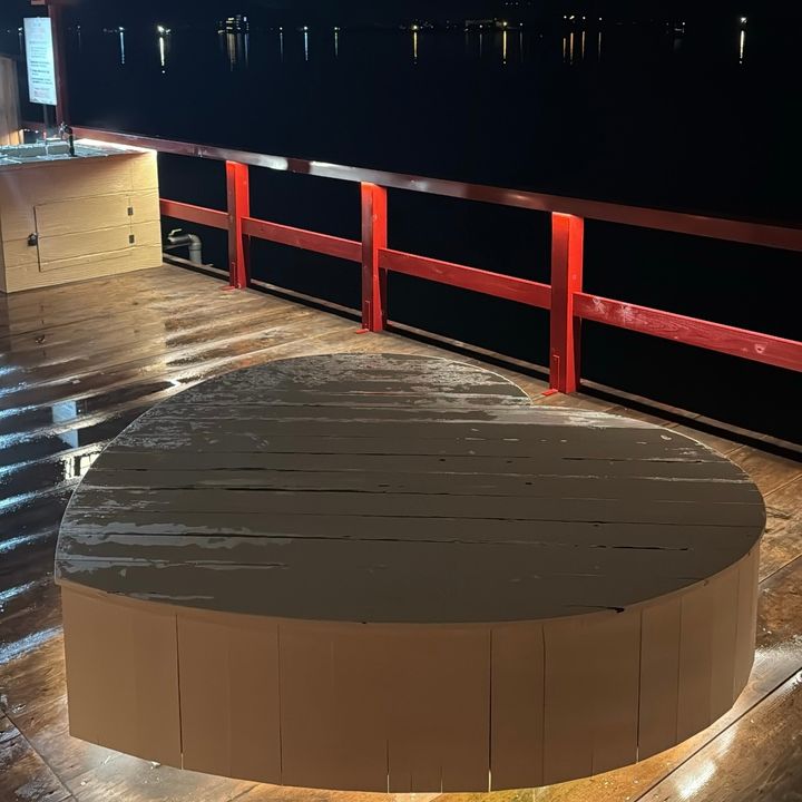写真の通り、この真ん中の御殿みたいなのが露天風呂で湖の上にあるんです!!