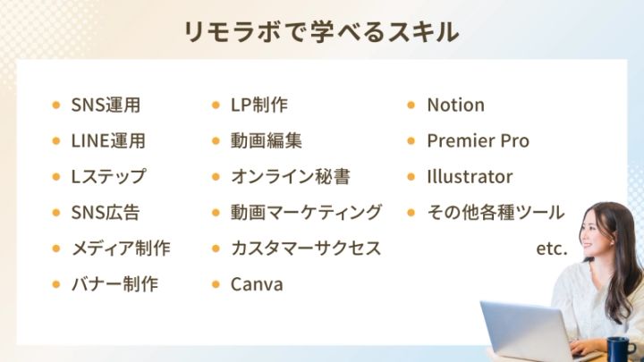 さらに、女性は「妊活」や「介護」といった人生のフェーズによって、まだまだ働き方が制限されてしまいがち。そこでリモラボでは、どんなフェーズを迎えても「自分らしく働く」を実現するためのスキルを身に付けることができるのです!