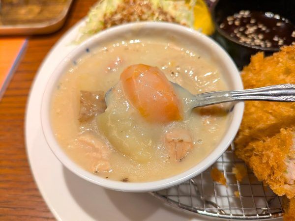 この日の日替わり定食は何ですかとお聞きすると、「珍しくシチューを作ったので、おいしいですよ」っと言われたので、そうだぁ。シチューを食べよう!(笑)日替わり定食は、メインのシチュー&ミンチカツに、キャベツ・香の物・お味噌汁・ご飯付きです。
