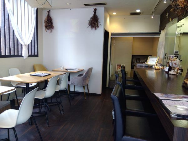 かわいい店内は、カウンター席、テーブル席、ソファ風席を合わせて15席