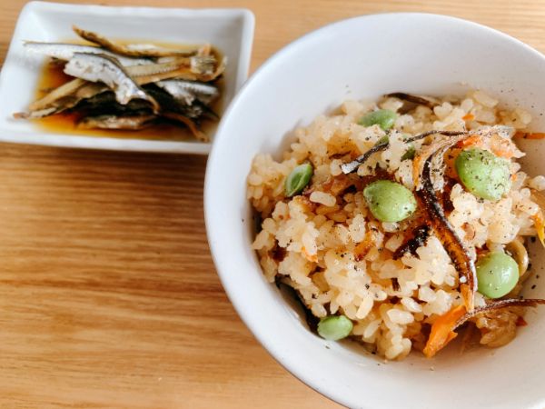 研いだお米に出し殻、人参、ごぼう、生姜、枝豆などを加え、酒、醤油で味付けし炊く。ほっこり優しい味。
