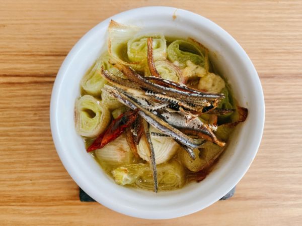 まず出し殻を敷いた上にネギを置き、その上にも出し殻。にんにく・唐辛子とひとつまみの塩を加え、ひたひたのオリーブオイルで煮る(レンジとオーブンを使用)。下に敷いたものと上に載せた煮干しの食感の違いがクセになる。