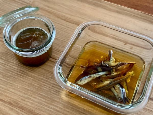 サラダ油やこめ油を使うと煮干しの風味がよくわかります。 味を引き出す低温調理と香りを引き出す高温調理のイメージで2種類。早めに使い切ること。