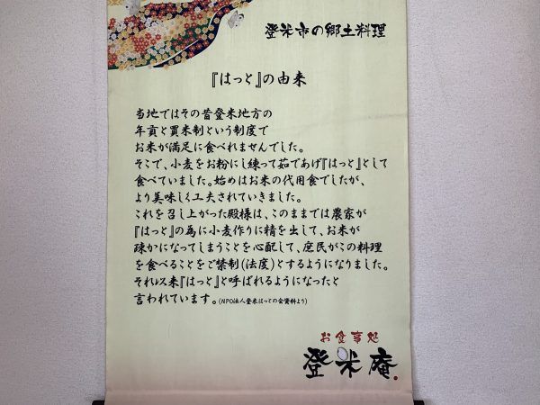 座った席の壁に「はっと」の由来が掛けられていました。こうした由来があったのですね。次回はぜひ「はっと汁」をいただきたいです、そして「お餅」も!