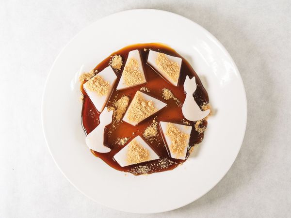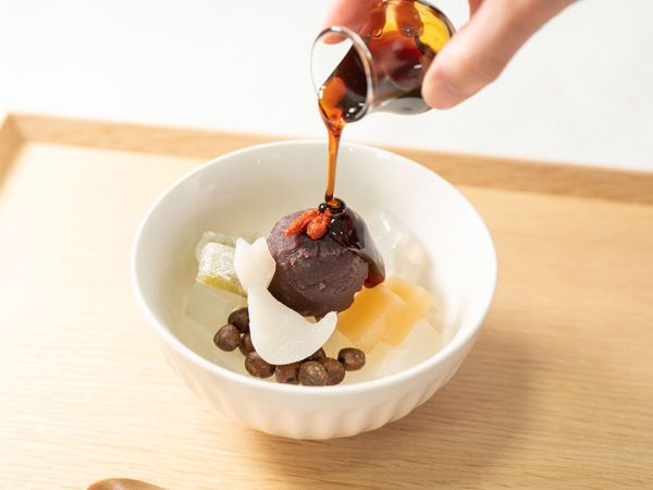 この「猫あんみつ」では、さらに見た目の楽しさを加え、味わいも見た目も特別なひとときが過ごせます。船橋屋秘伝の濃厚な黒蜜をたっぷりかければ、寒天やあんこと絶妙に絡み合い、深みのある甘さが口いっぱいに広がります。赤えんどう豆の程よい塩味が甘さを引き立て、全体のバランスをより一層引き締める仕上がりです。「猫あんみつ」は、見た目の可愛らしさと船橋屋ならではの素材や製法へのこだわりが融合した特別な和スイーツ。愛らしい猫型のくず餅が楽しいだけでなく、その贅沢な味わいは贈り物にもぴったりです。