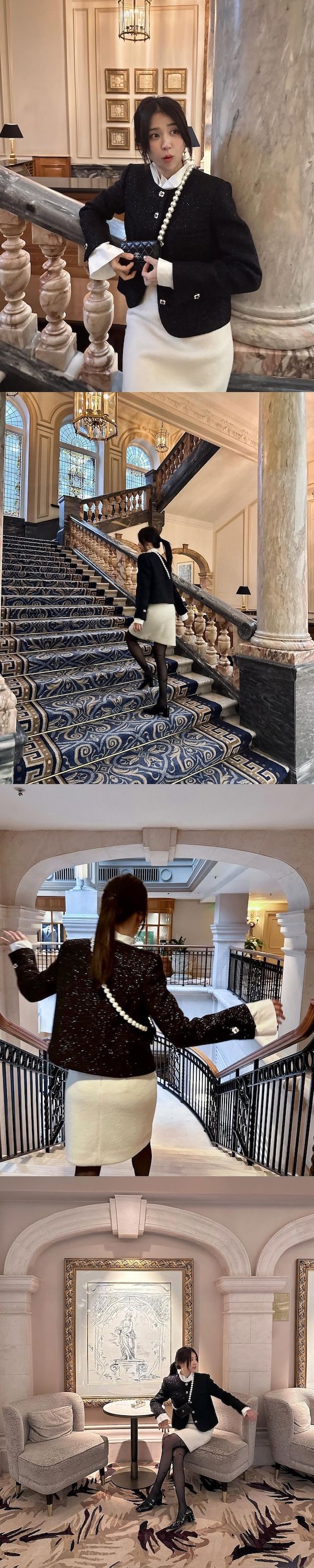 このほど、知人の結婚式に参列したようなパク・ハソン。彼女は白いワンピースに黒のツイードジャケット、かわいいミニバッグを合わせ、上品なお呼ばれコーデのお手本を披露している。