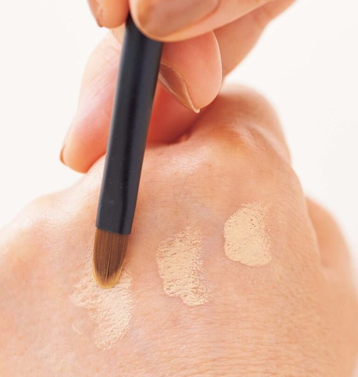 ファンデーションを塗った後、それでも目立つ濃いシミにコンシーラーを重ねます。平筆を使用したほうが狙ったところにつけられるうえ、なじませ過ぎによる失敗も防げます。