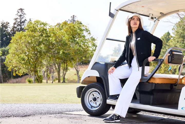 ボディラインをきれいに見せることに長けた韓国ブランドは、パンツ派ゴルファーにとっても心強い味方です。これからの季節に一本あると便利なのが、絶妙なストレートラインで誰にでも穿きやすく、大きめのアウトポケットや裾のスリットがおしゃれな白パンツ。コンパクトな黒のニットブルゾンでメリハリを作り、ハンサムスポーティなゴルファーに。