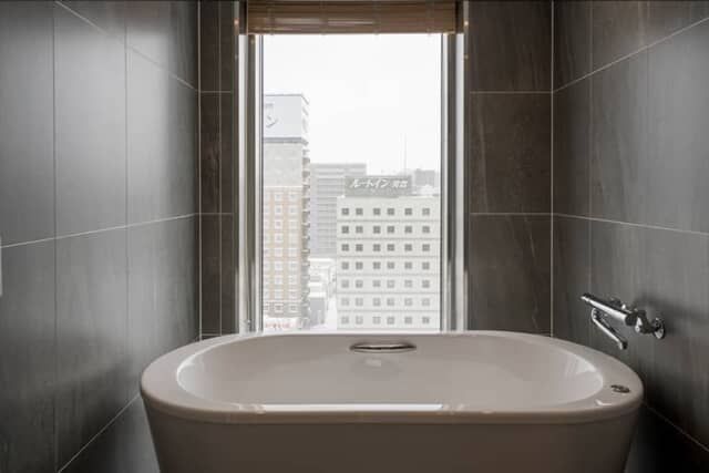 据え置き型のバスタブは特別感たっぷり。もちろんロールスクリーンも備えます。