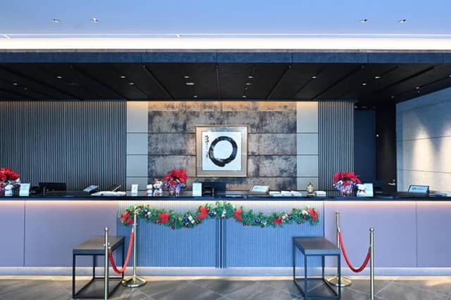青森港には年間40隻ほどのクルーズ船が寄港するため、外国籍や海外ルーツのスタッフも多く、国際ホテルとしての役割も担います。レセプションの中央に飾られたホテルのロゴは禅における書画のひとつ「円相(えんそう)」。京都清水寺で毎年恒例の “今年の漢字” を書き上げる森清範貫主の手になります。