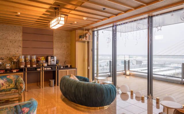 6階には宿泊者なら自由に利用できるラウンジがあり、スナック菓子やドリンクを楽しめます。天気のいい日は陸奥湾に向いたテラスにも出られます。