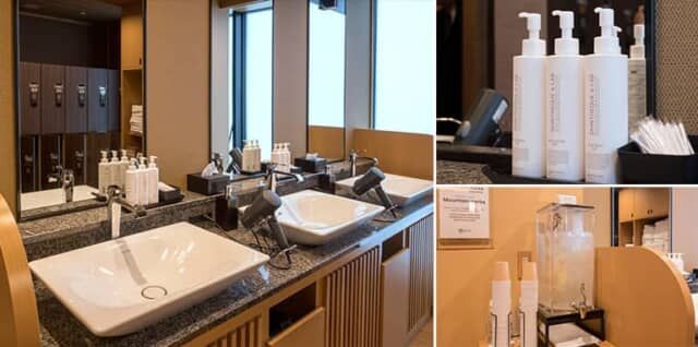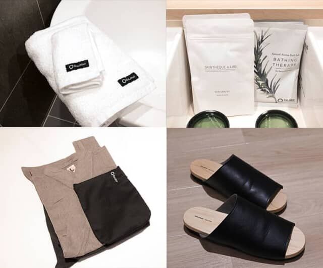 大浴場にはタオル類を備えているので手ぶらで利用できます。ロッカーは暗証番号式。基礎化粧品は、最新のスキンケアの理論に基づいて研究開発された「スキンテーク&ラボ」が選ばれています。