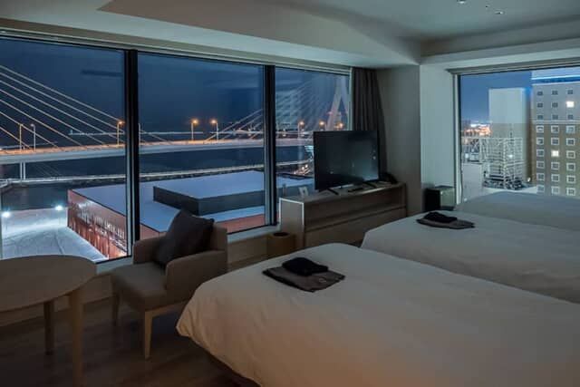 3人で利用しても十分なほど広いトリプルベッドのツーリストルームは39平米。青森の街と陸奥湾に向いた角部屋で、2方向が全面窓になる解放的な客室です。部屋は青森の県花であるりんごの白い花をイメージした明るい彩りを採用しています。