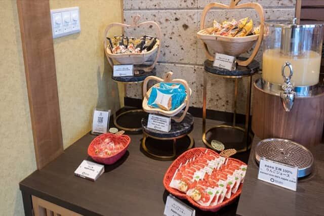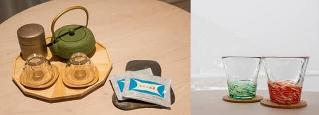 津軽びいどろのグラスや南部鉄器の茶器など伝統工芸品が置かれます。お茶菓子は青森のブランド米「晴天の霹靂」を使ったおせんべいで、さすがの美味しさ。抗酸化作用のあるお茶を用意するのも、健康志向の現れです。