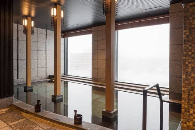 男女とも温泉の内湯があり、松葉啓氏の特徴的な柱のデザインが湯船でも見られます。温泉は病院の近くから沸く慈恵会源泉の運び湯で、ホテルに毎日運ばれます。泉質は弱アルカリ性の単純泉で、サラサラとした肌になじみやすい湯ざわりです。