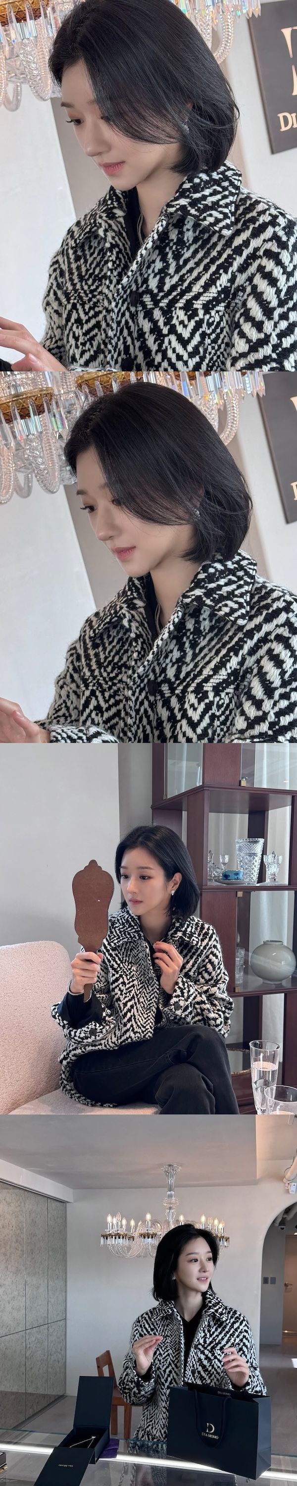 写真に写っているのは、ジュエリーショップを訪れたソ・イェジの姿。彼女はピアスを試着し、手鏡を覗いている。