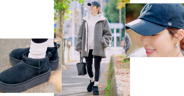 MYLĀN×’47のキャップは上品なロゴが使いやすく、周りのインターママとのカブり率も高めで「同じの持ってます」と話しかけられることも。UGGのブーツはレギンス×ソックス合わせで今っぽく。