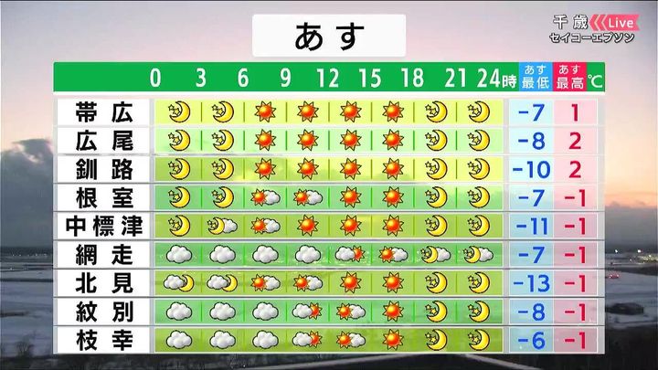 道東を中心に晴れるでしょう。最低気温は帯広や北見で14日朝より4度ほど高くなります。日中は0度前後ですが、窓辺では日ざしの温もりが感じられます。