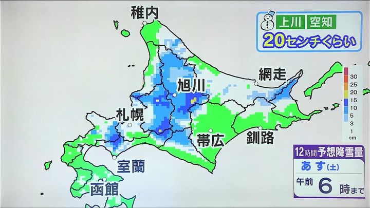 14日夜も雪の降り方に注意が必要です。15日午前6時までの12時間に降る雪の量です。濃い青や黄色の旭川や層雲峡、深川、夕張周辺で10センチから20センチです。強い雪や吹雪に注意してください。