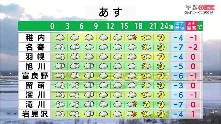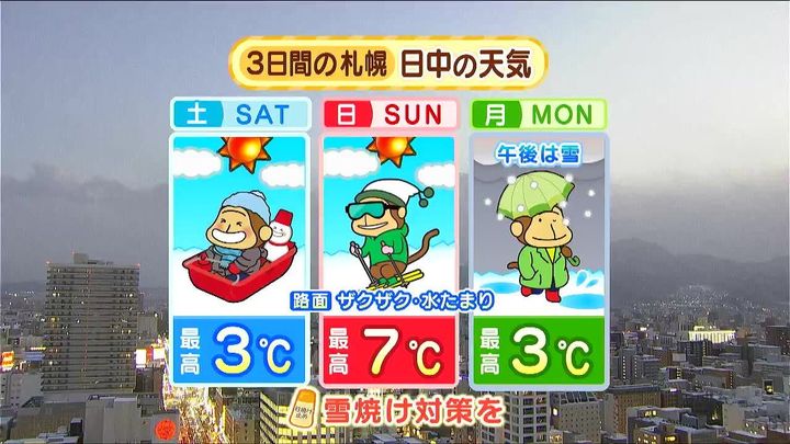 日曜日も広く晴れて、最高気温は札幌で7度、旭川は3度となるため、落雪などに注意して下さい。