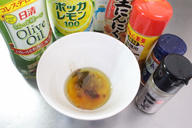 2. ボウルにオリーブオイル、カレー粉、パプリカパウダー、にんにく、塩、こしょう、レモン汁を入れて混ぜ合わせます。