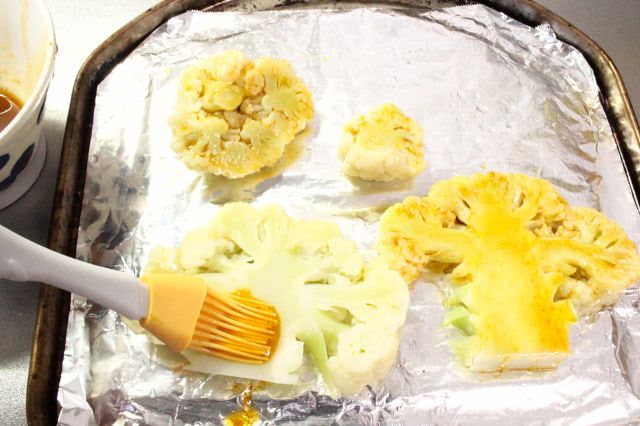 3. 茹でたカリフラワーを厚さ3cmに切り、サラダ油を塗った天板に並べて断面に2をハケでしっかりと塗り込みます。