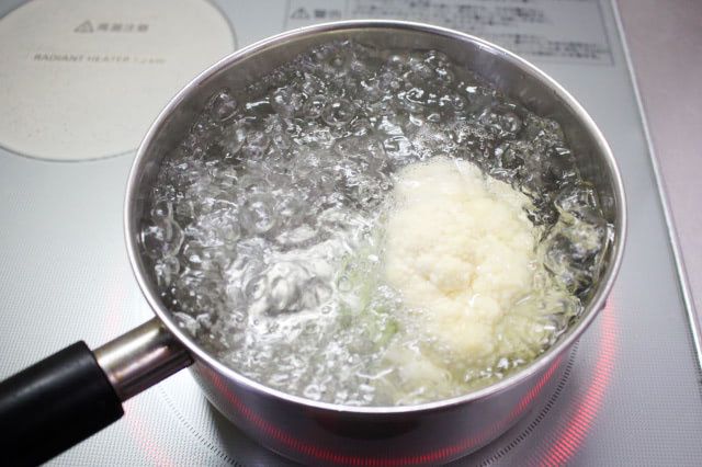 1. 沸騰したお湯に塩(分量外・適量)を加え、葉を取り除いたカリフラワーを5分茹でてザルにあげます。