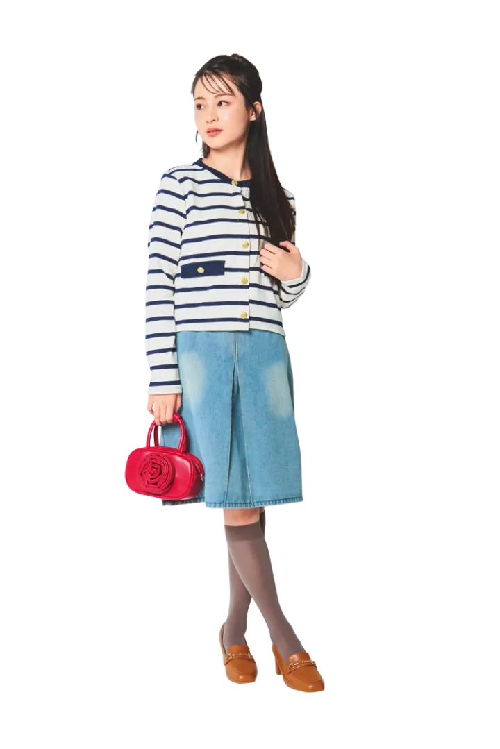 ボーダーカーディガン 5,990円/MANGO デニムスカート 4,399円/W♥C バッグ 4,950円/Birthday room(アンティローザ)ハイソックス 880円/靴下屋(Tabio)ローファー 7,700円/オリエンタルトラフィック(ダブルエー)