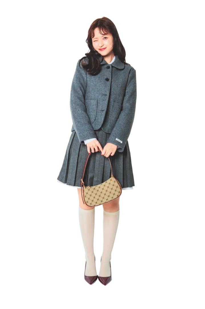 フォーマルなセットアップは時代を問わず、お嬢様ルックに仕上がる優秀服。白のハイソにキレイめ靴で足元までぬかりなく!