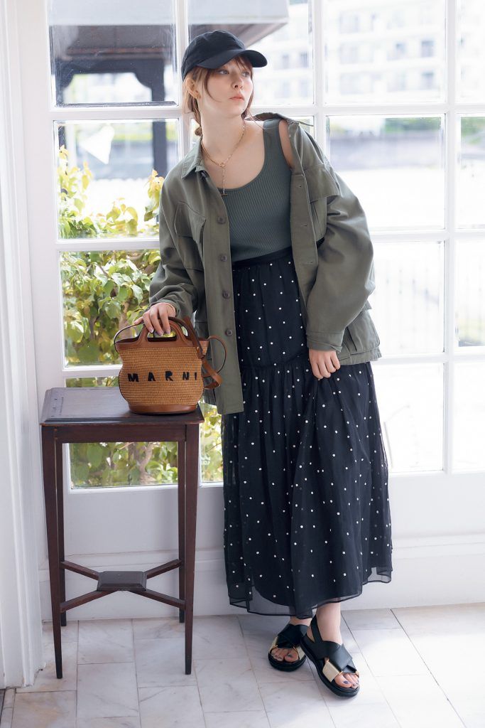 辛口配色にふんわりスカート…抜け感のある甘辛ミックスが気分。サンダル〈H3.5㎝〉¥118,800バッグ¥158,400(ともにマルニ/マルニ ジャパン クライアントサービス)ジャケット¥30,800(アンド アールシー/カレンソロジー新宿)ニット¥11,000(カオス/カオス表参道)スカート¥95,700(ジュープ・バイ・ジャッキー/ルル・ウィルビー)キャップ¥4,400(ニューエラ)ネックレス¥39,600(リューク)ピアス¥107,800 バングル162,800(ともにウノアエレ/ウノアエレ ジャパン)