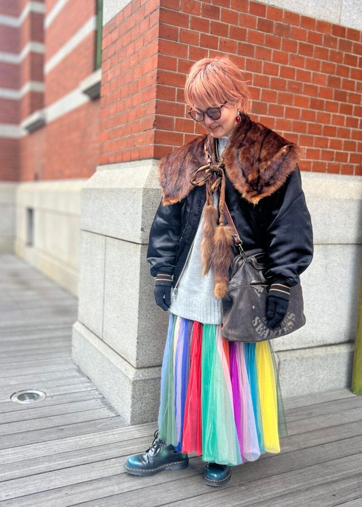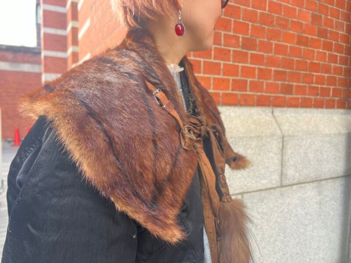 カラフルなスカートよりも強いインパクトを放っていた毛皮のつけ衿。「これは大阪のアメ村の古着屋さんで見つけました。味のあるおもしろい服が大好きで、そんな服を見つけること、そして自分で作ることが人生の楽しみです」と、Laugh mikaさん。