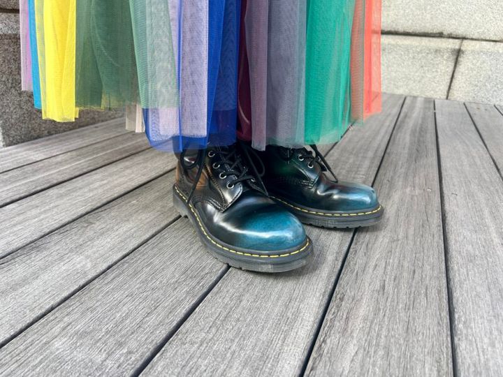 50歳のお誕生日に旦那さんにプレゼントしてもらったという、ドクターマーチンの8ホールブーツ。「個性的なのに、いろんなコーディネートに合わせやすくて、いま一番のお気に入りです」。