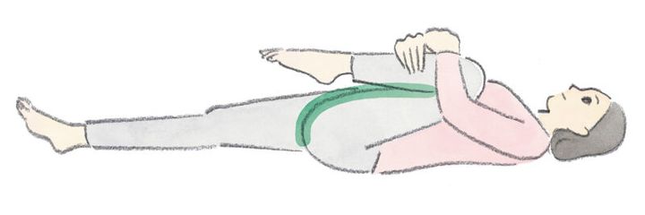 左ひざを曲げた状態であおむけになります。両腕を頭の上で組み、30秒間キープ。反対側も同様に3回ずつ。