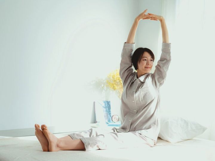 筋肉に刺激を与えることで血行を促し、体をスッキリ目覚めさせられます。写真のストレッチのほか、ベッドでできるストレッチを2つ紹介。