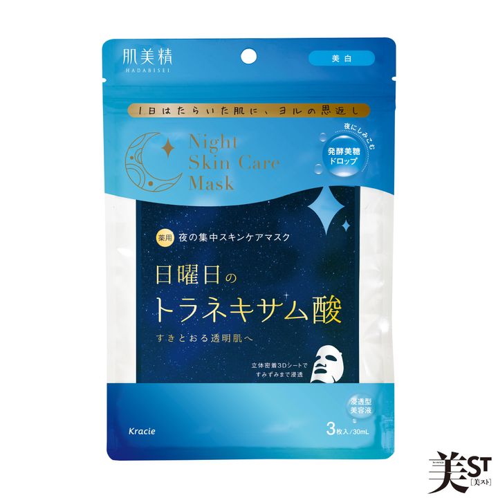 日曜日のレジャーやお出かけで「紫外線を浴びてしまった…」と思ったらこの1枚!潤いバリア成分の発酵美糖ドロップが夜の間に染み込み、翌朝は潤沢バリア肌に。トラネキサム酸配合で肌もトーンアップ。3Dシートだから小鼻や顎下まで立体的にピタッと密着し、角質層まで美容成分を届けます。ナイトケアに特化したマスク。肌美精 薬用日曜日のナイトスキンケアマスク 3枚入り ¥825※編集部調べ[医薬部外品](クラシエ)