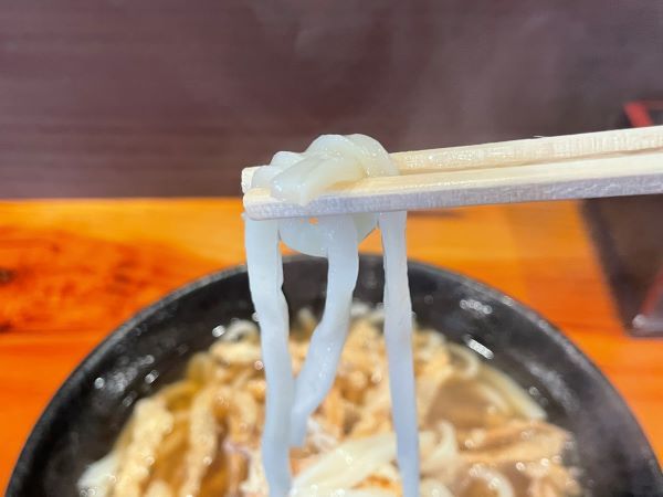 うどんは柔らかい博多うどん系です。もちっとした食感です。 スープは、昆布とイリコ出汁の風味豊かな醤油ベースのようなほんのり甘いスープ。 ごぼ天は、カリッとした細切りステックと、スープに浸った衣がドロッとした変化も楽しめました。 追加でオーダーしたいなりが、酢飯が若干強めで、甘いスープと良いコンビネーションでした。 スープも含めて全て完食しました。ご馳走様でした!